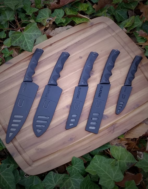 These knives exceeded my expectations. They are very sharp and well weighted. The grip is really great, no slippage at all. Additionally the sheathes to protect the knives ( and me) along with the well designed case make it great for the camper, no banging against each other or getting tangled up with other stuff. Also makes them easy to use in the outside kitchen, at the grill/campfire. Thinking of getting some for Xmas gifts!